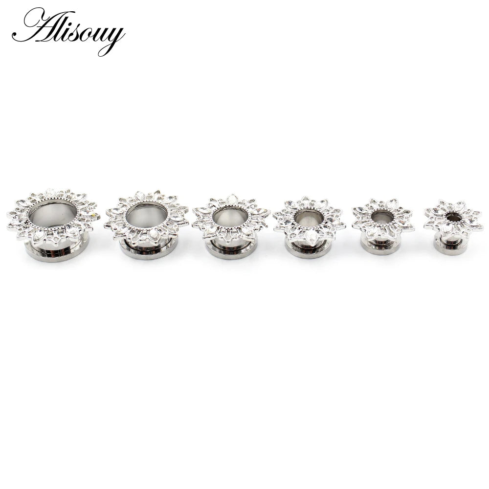 Alisouy 2pcs Stainless Steel Flower Zirconia Moon Star Clock Heart Screw Ear Tunnels Plugs Expander Gauges Body Piercing Jewelry